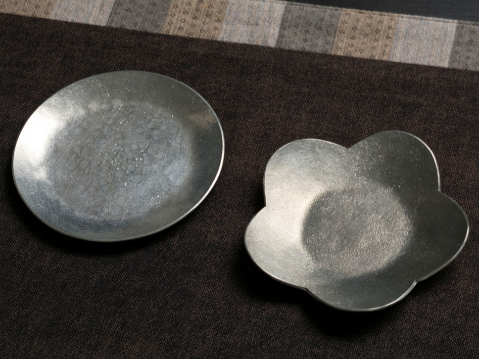 【錫のお手塩皿】は、約9cmの丸いお皿。【錫の花小皿】の写真は 「梅」、他に「桜」と「桔梗」が選べます。食器としても、アクセサリートレイなどにいかがでしょう。