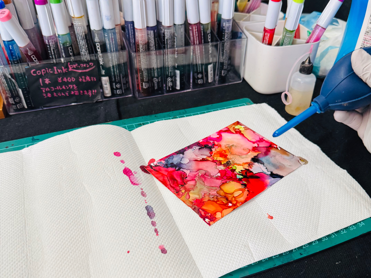 アルコールインク・エタノールを使って風を使い描くアート体験です。