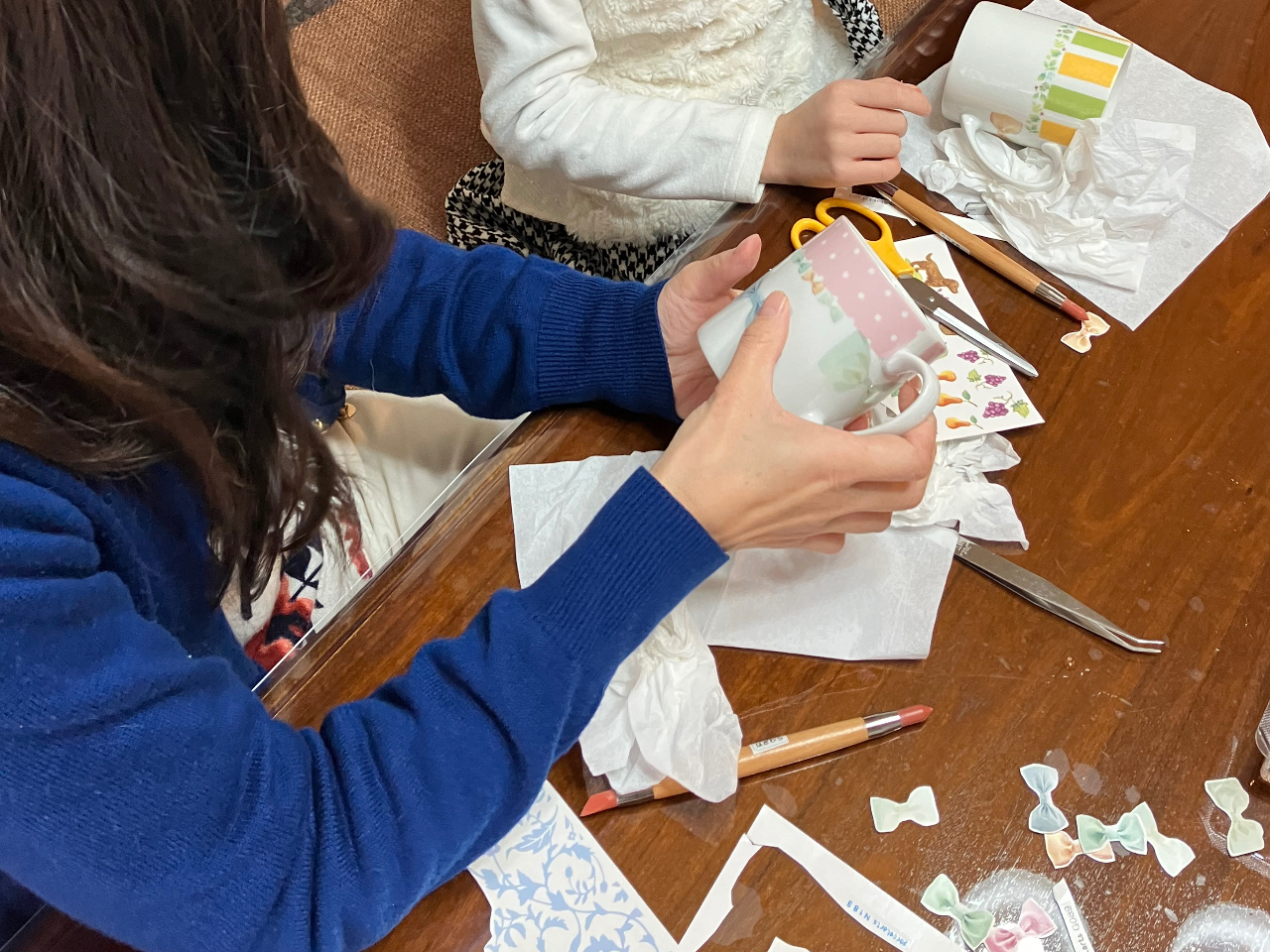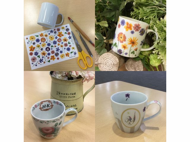 ポーセラーツ…お好きな転写紙をアレンジして貼るだけ。マグカップまたは16センチ皿を作ります。