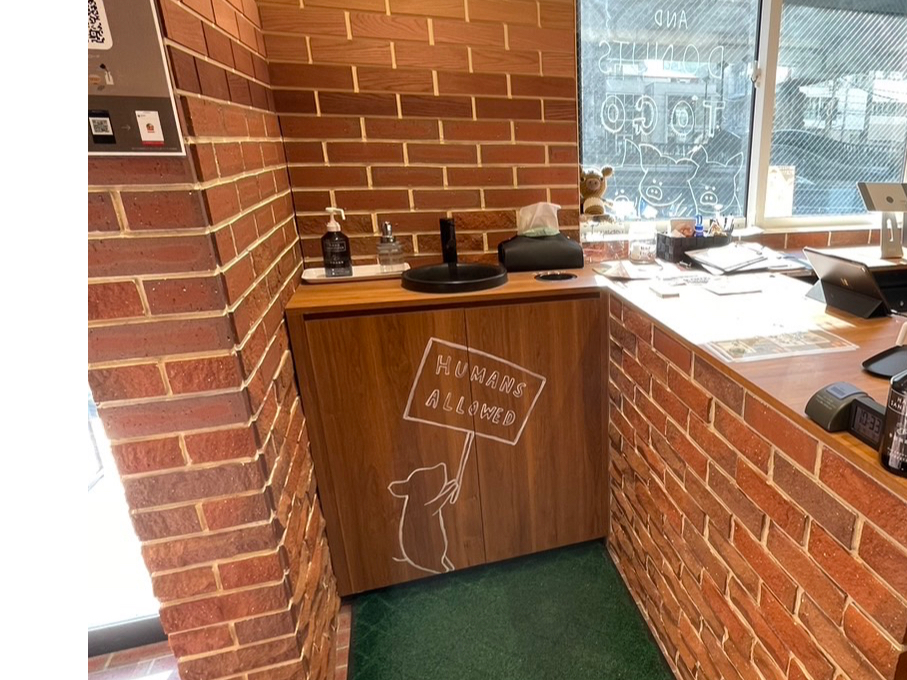 内装には童話「三匹のこぶた」をモチーフにしたデザインが施されています。レンガの床、木の壁、珪藻土の天井にはワラが混ぜ込まれ、まるで童話の世界に迷い込んだかのよう。かわいいブタちゃんスイーツや店内のウォールペイントもインスタ映え間違いなし!!上質でおしゃれな空間で、元気なマイクロブタ兄弟たちがお客様をお迎えします。