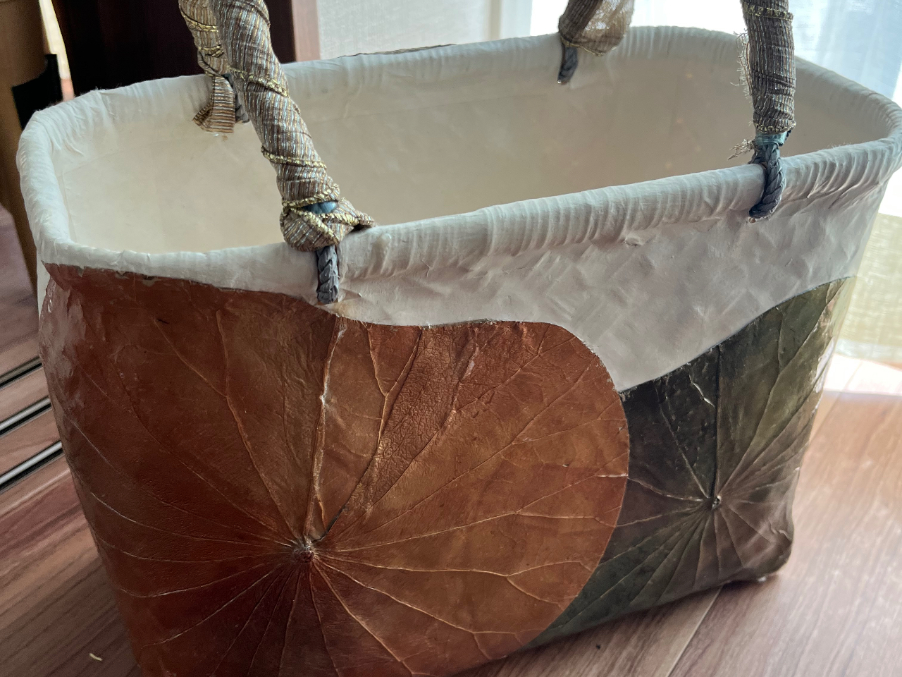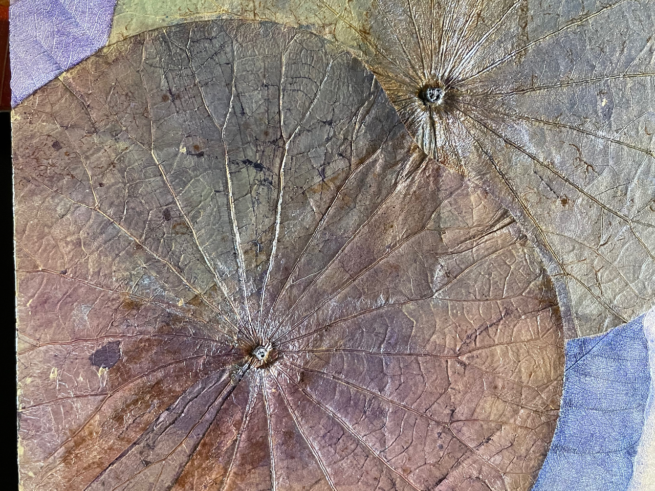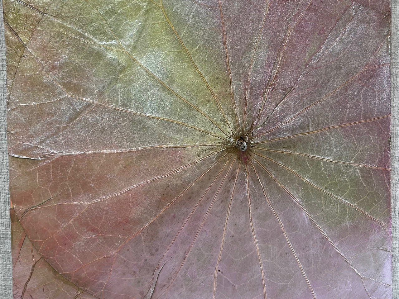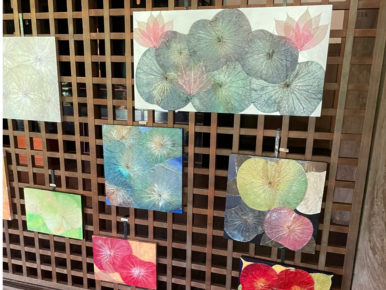 41cm×41mの木製パネルに天然の蓮の葉やインド菩提樹を自分で貼り着色します。