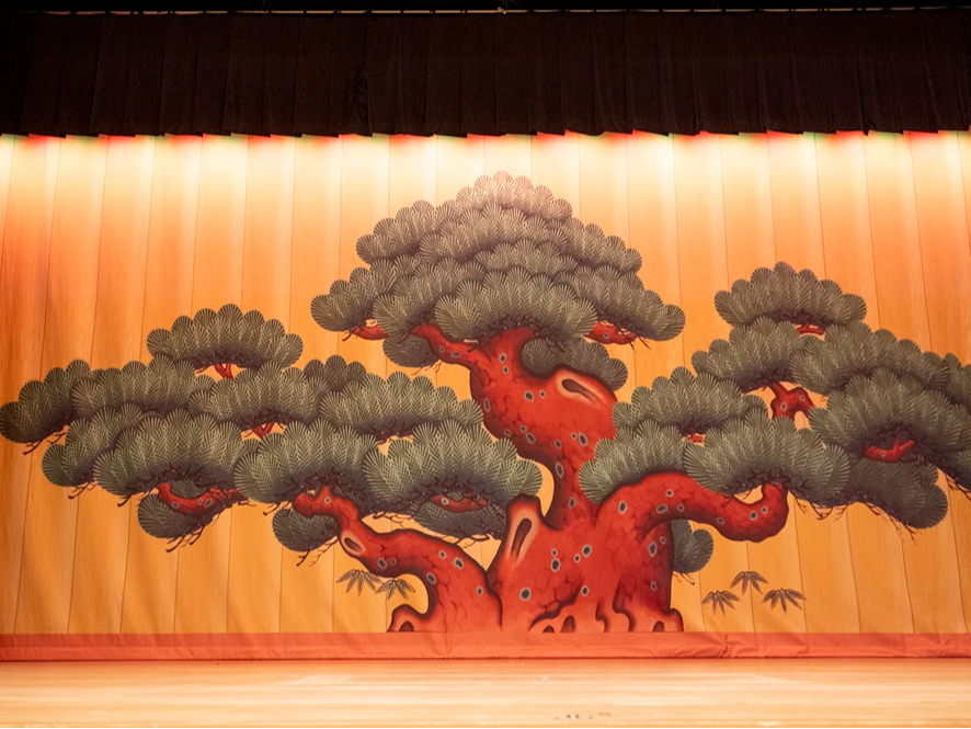 弁天座の松羽目(能舞台をまねて、舞台の正面に老松(おいまつ)を描いた舞台装置)