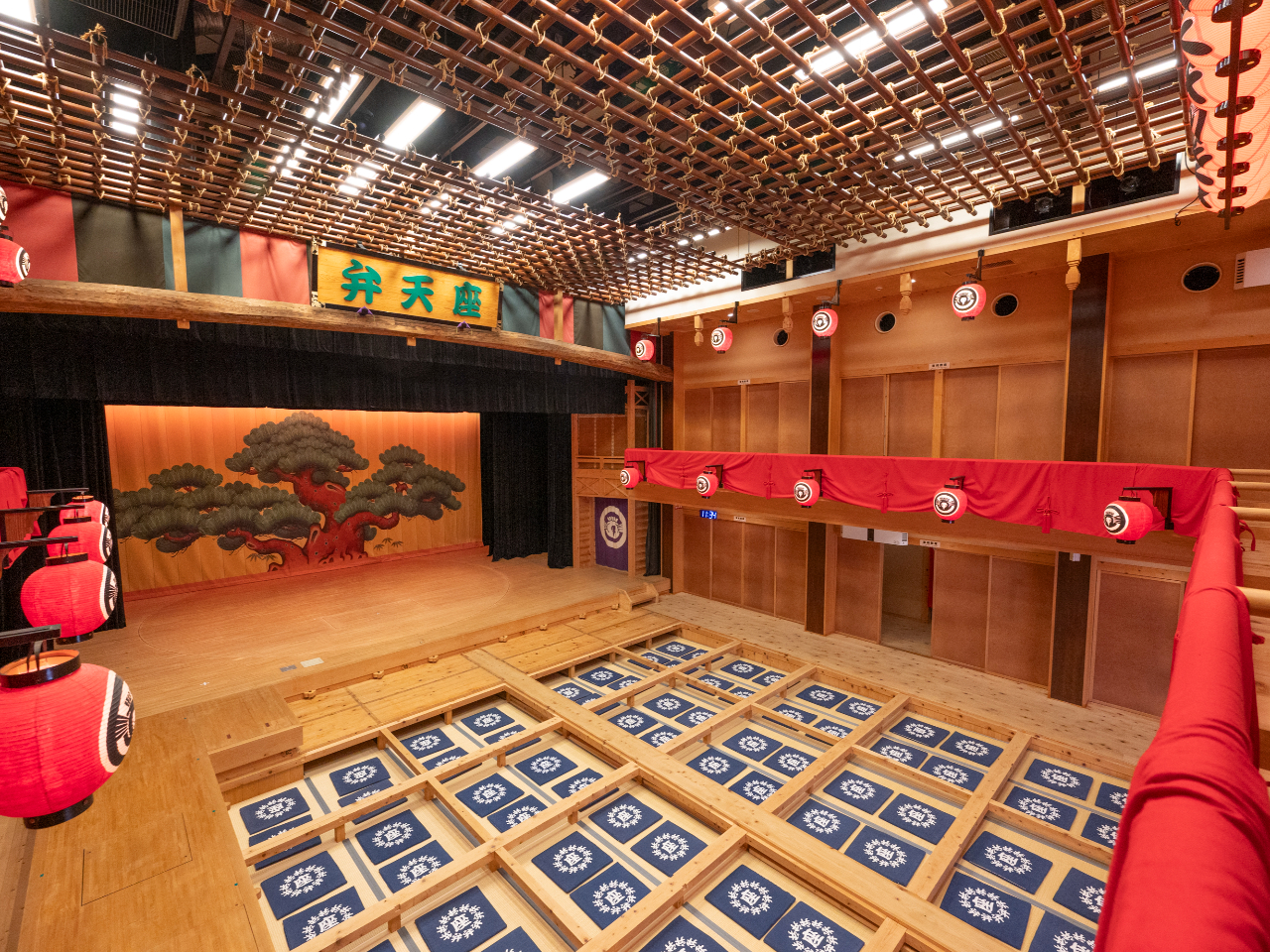 舞台は総桧貼りで、歌舞伎や演芸などの伝統芸能などの伝統芸能の演出に適した廻り舞台や迫り・すっぽんなど様々な機能を整えています。また、座席は升席となっており、昔ながらの芝居小屋の雰囲気のなか、イベントをお楽しみいただけます。なお、升席は板張り(平場)空間との衣替えが可能なつくりとなっており、幅広い用途にご利用いただけます。