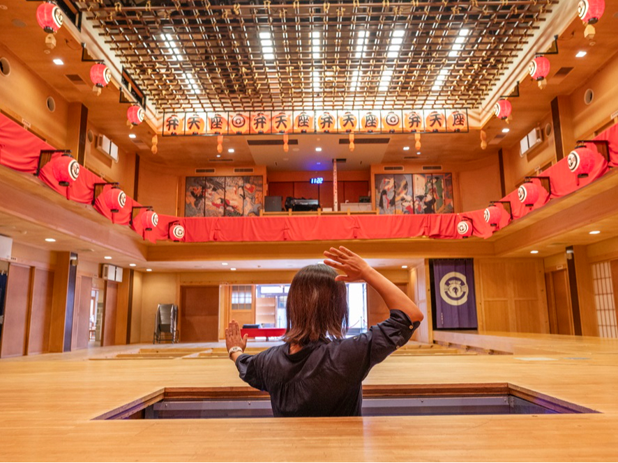 めったに体験できない「廻り舞台」や「セリ体験」ができ、役者気分に!!日本文化