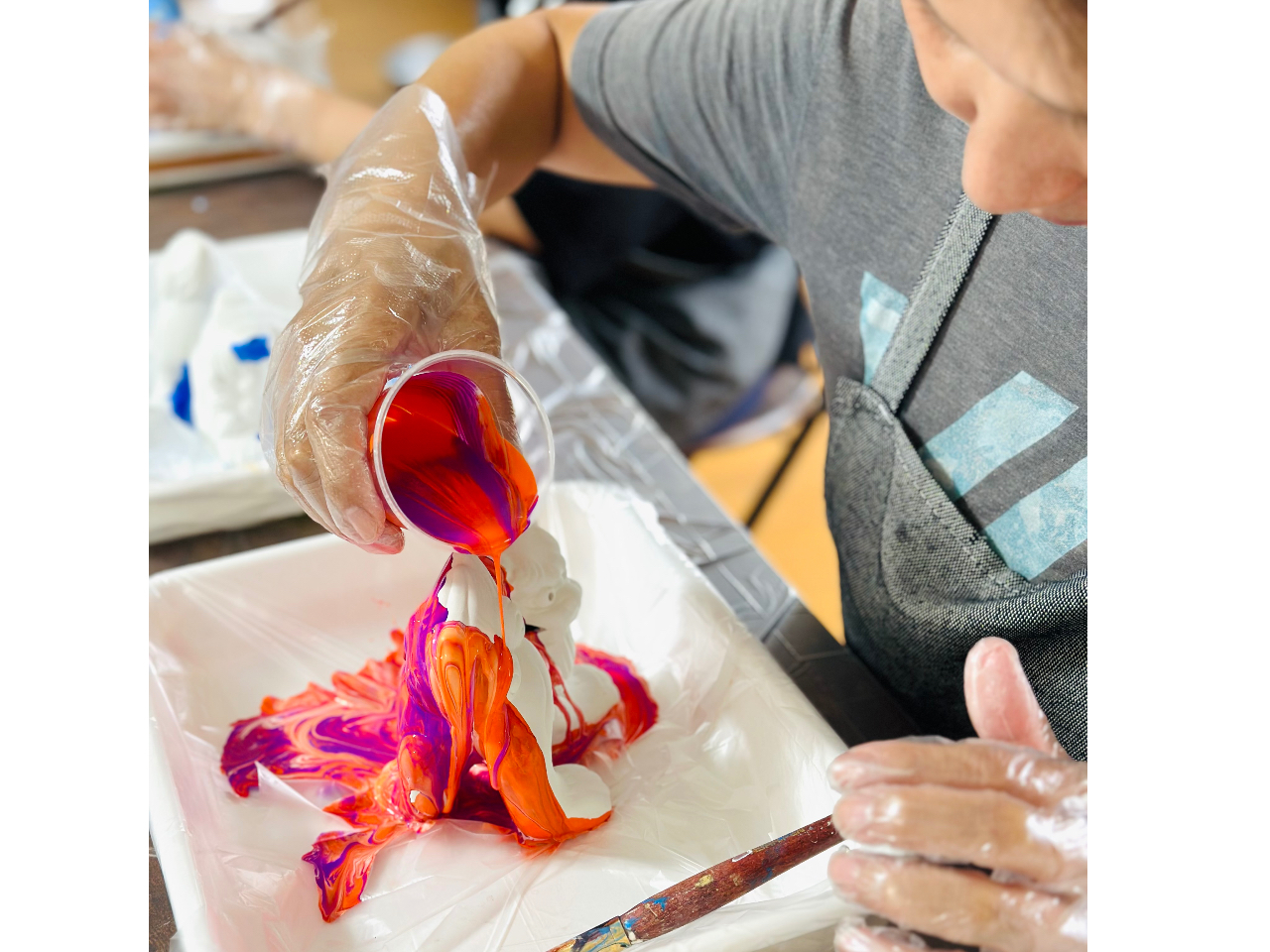 ポーリングアートとは”注ぎ込む”という意味で、キャンバスやフィギュアなどにさまざまな色を垂らしマーブルのような独特の模様をつくるアートです!