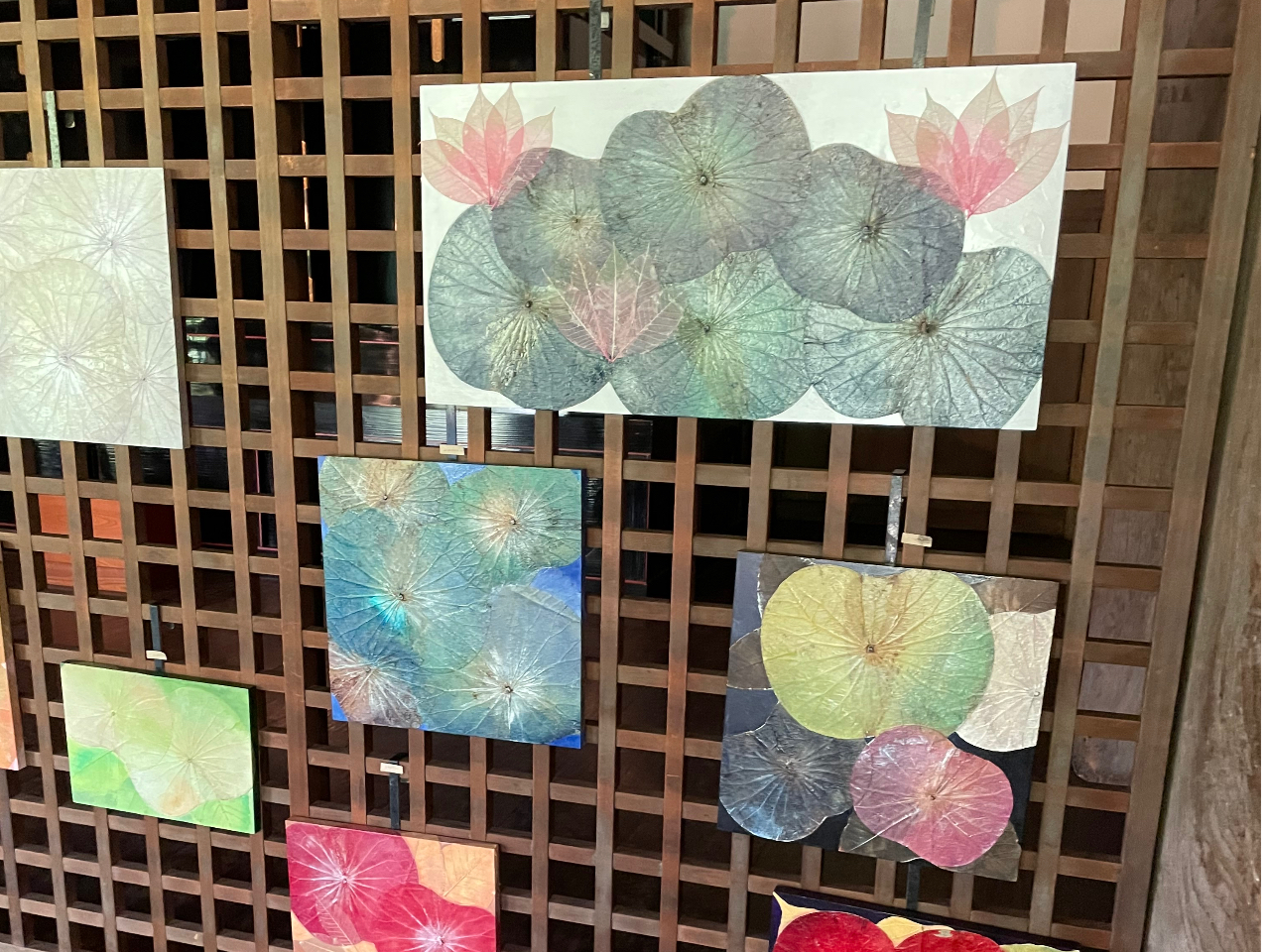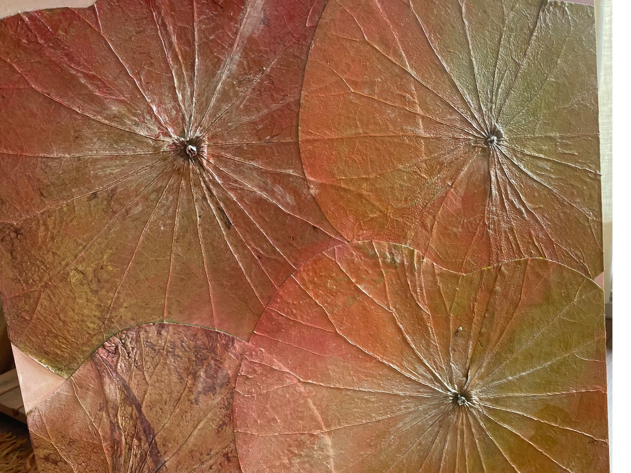41cm×41mの木製パネルに天然の蓮の葉やインド菩提樹を自分で貼り着色します。