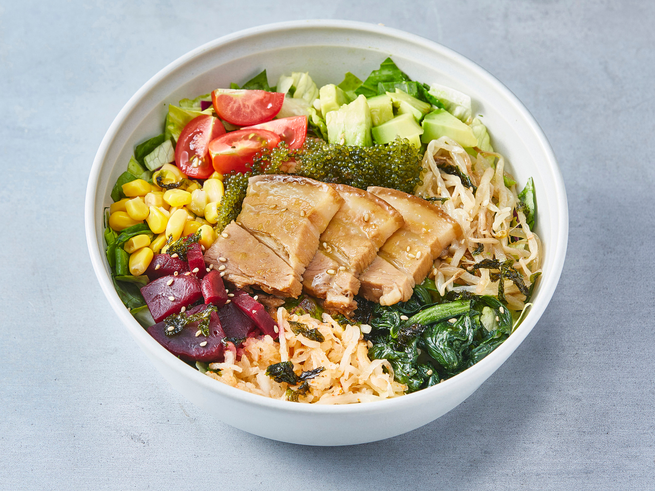彩り豊かに盛り付けられたサラダボウルのトッピングは、アボカドやトマト、ビーツなどのさまざまな野菜に玄米かロメインレタスを選んでいただけます。