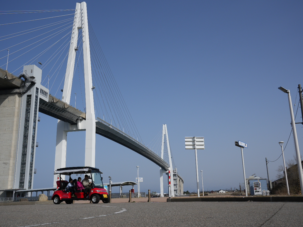 ドアのない開放的な車内から射水ベイエリアの景色や音、風を感じながら最高速度19km/hのゆっくりとしたスピードで走行。