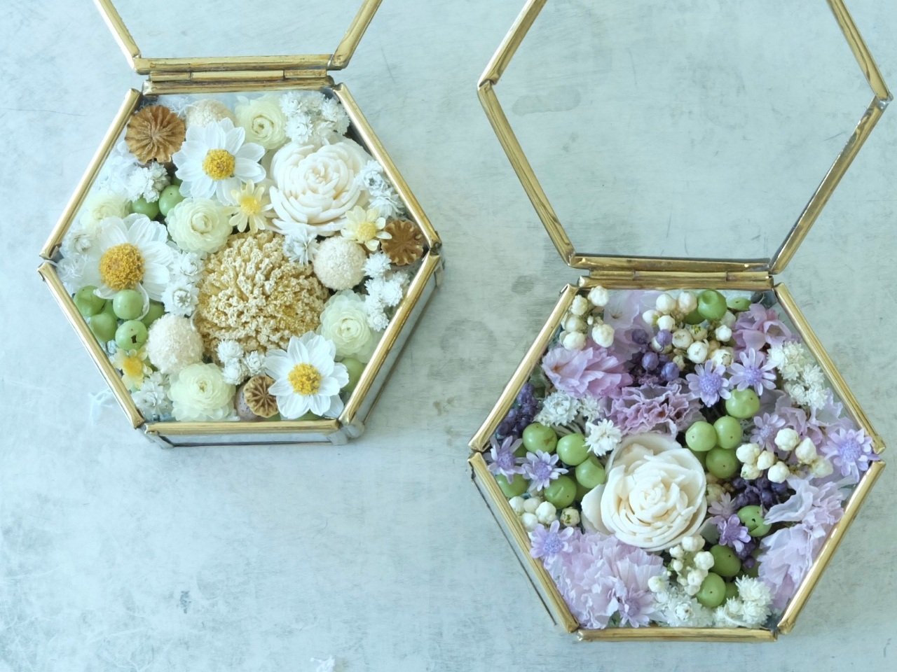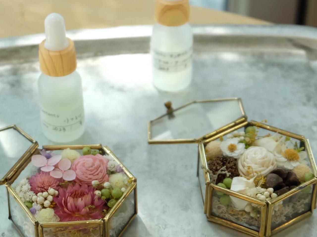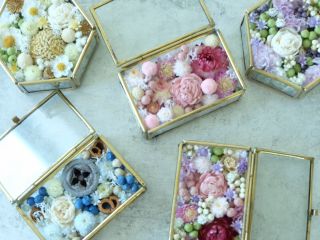 手のひらサイズの小さな宝石箱にお花を詰め込んで、オリジナルの香水を吹きかければ、あなただけの癒し空間ができあがり♪精油のブレンドはAEAJ認定アロマブレンドデザイナーが丁寧にサポートいたします。