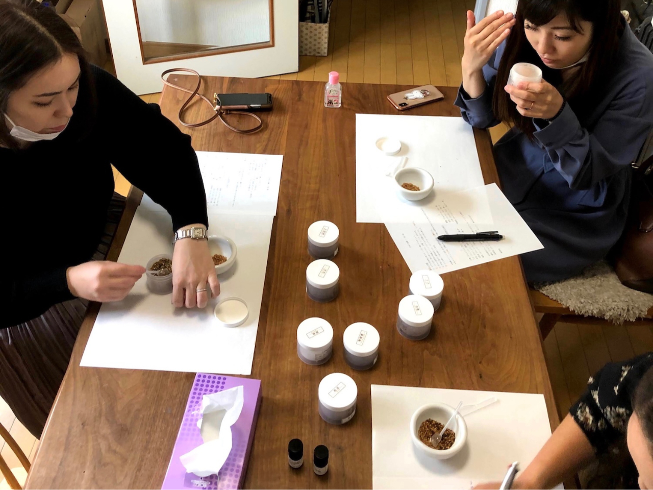 香りの原料を調合してゆきます。同じ原料でもサジ加減で違いが出てきます。初対面の方同士も、いつのまにか和やかに作品を見せ合ったり楽しんで頂いてます。