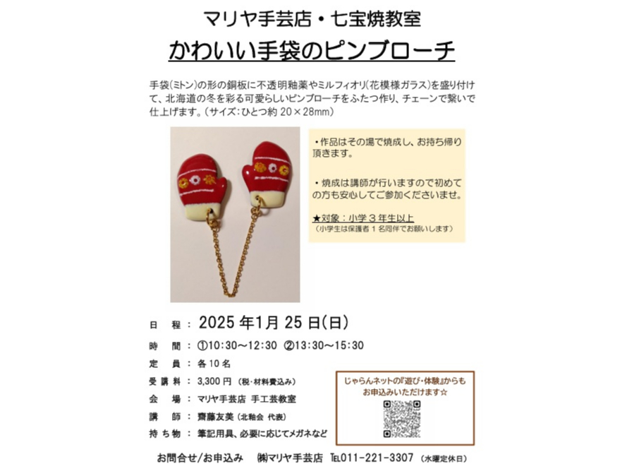 札幌時計台すぐ近く 七宝焼き体験教室 かわいい手袋のピンブローチ制作 2026年1月25日(日)@10:30〜12:30 A13:30〜15:30
