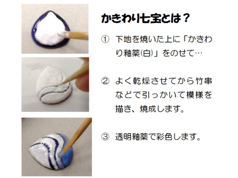 七宝焼きの流れからマーブル技法の要領とコツを教わり普段と違う体験が出来て楽しかったです。ただ、釜の前にいると暑くてヒヤヒヤした。