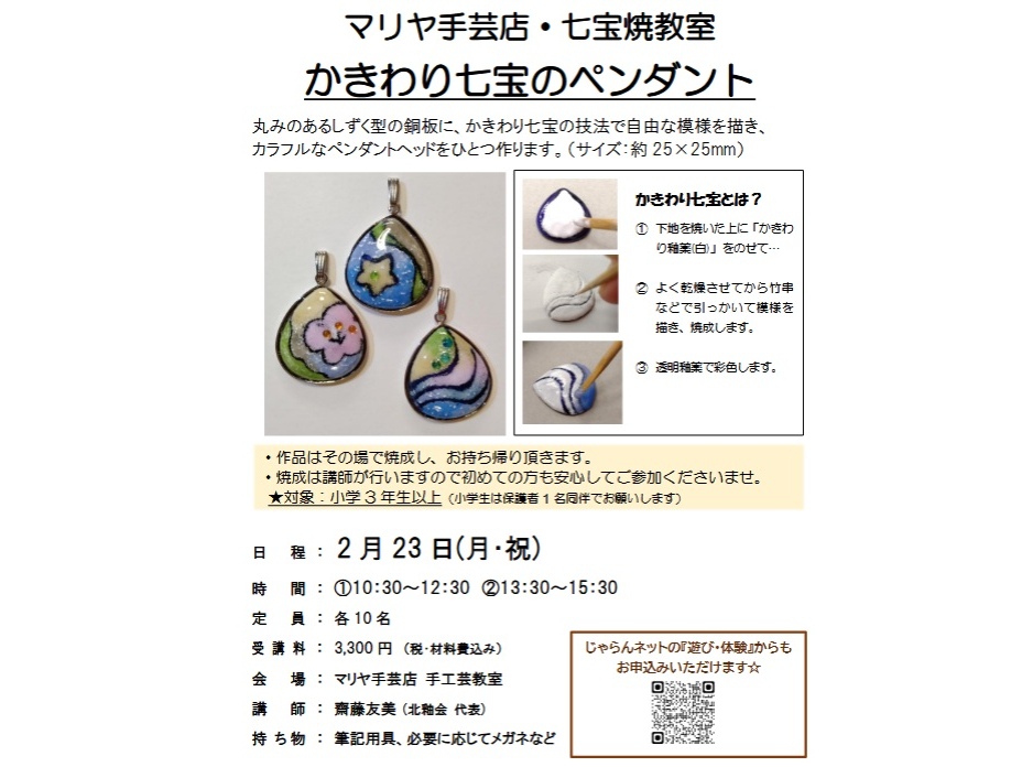 札幌時計台すぐ近く 七宝焼き体験教室 かきわり七宝のペンダント制作 2026年2月23日(月・祝)@10:30〜12:30 A13:30〜15:30