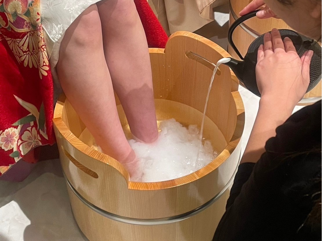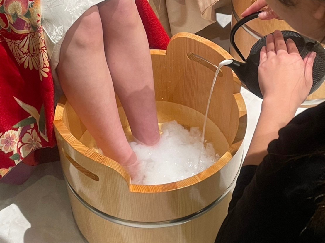 今回は、花を浮かべる足湯と塩を入れる足湯のプランをそれぞれ体験。花のプランでは、足元に花がふわりと浮かび、ほんのりと香りも漂っていて、とても贅沢な気分に。塩の足湯は体の芯から温まる感覚でした。