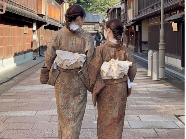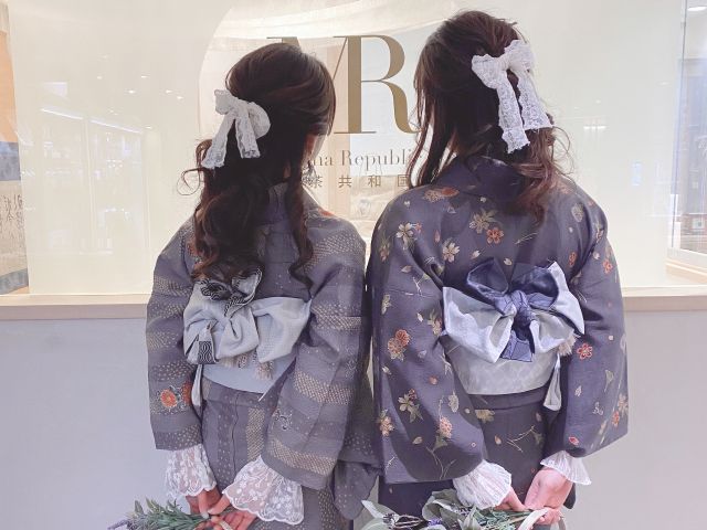 アンティーク着物をご利用いただける特別 プランです。ビンテージ調のシックなものから大人 かわいいお着物まで、色々なテイストからお選びい ただけます。多様な金糸銀糸の入った豪華な半幅 帯と組み合わせますが、名古屋帯のオプションご 利用も人気です♪