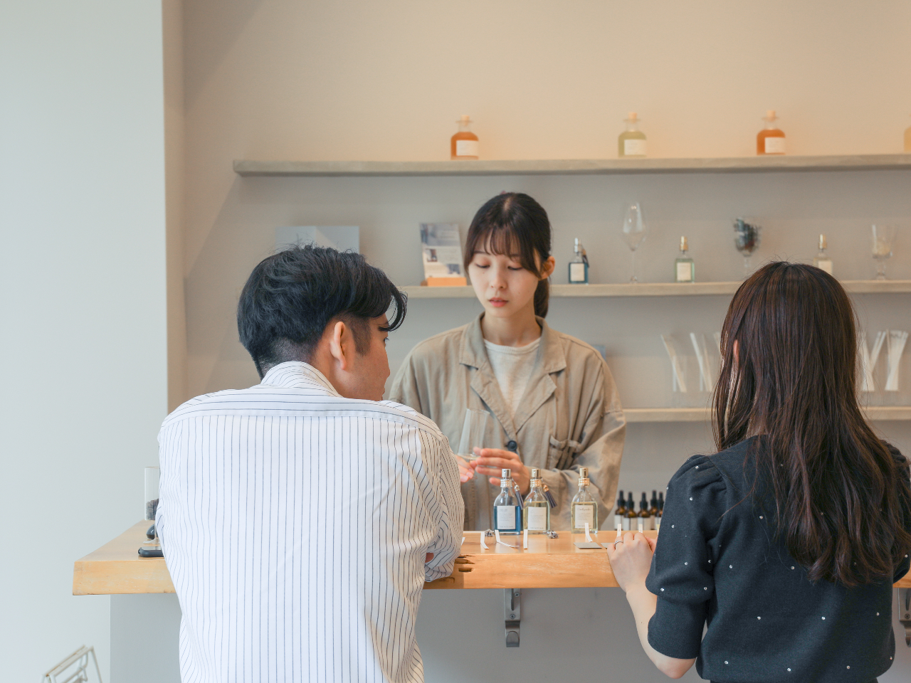 連休明け、会社のお昼休み、香水を作りにいきました。お昼休みで時間が限られていたので、その日には調合の香りと配合を決め、翌日に取りに行くことで対応してくださいました。短い時間で緊張しながらも、私の希望を素早くあわせてくださり、無事によい香りが出来ました!店内にはバスソルトや調合された香水もあり、プレゼントようにそちらも購入。香りを選ぶのも、出来上がりも、楽しみでワクワクしました。素敵な時間をありがとうございました。
