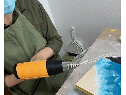 ヒートガンで白い波を作っていきます。ここがとっても楽しいポイント!!
