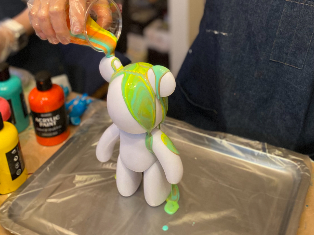 ベアーアートとは液状にしたアクリル絵の具をフィギュアの上から流しマーブル模様などの様々な色彩表現を生み出しながらオリジナルフィギア作りを体験