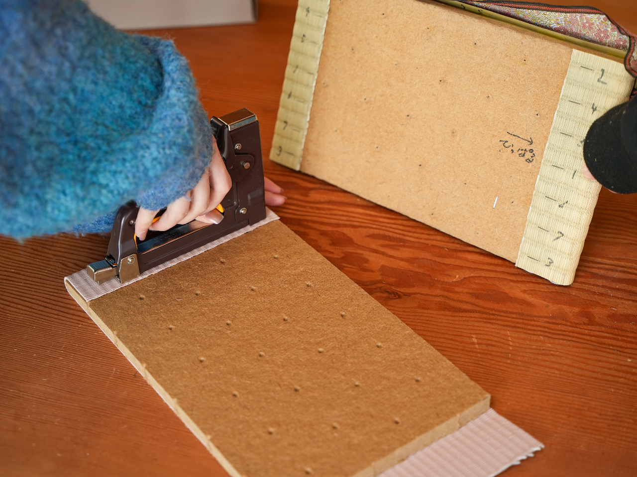「高島ちぢみ」工芸の歴史を学びながら、高島ちぢみを縁使いしたミニ畳作りが体験いただけます!ミニ畳も国産の物を使用します。