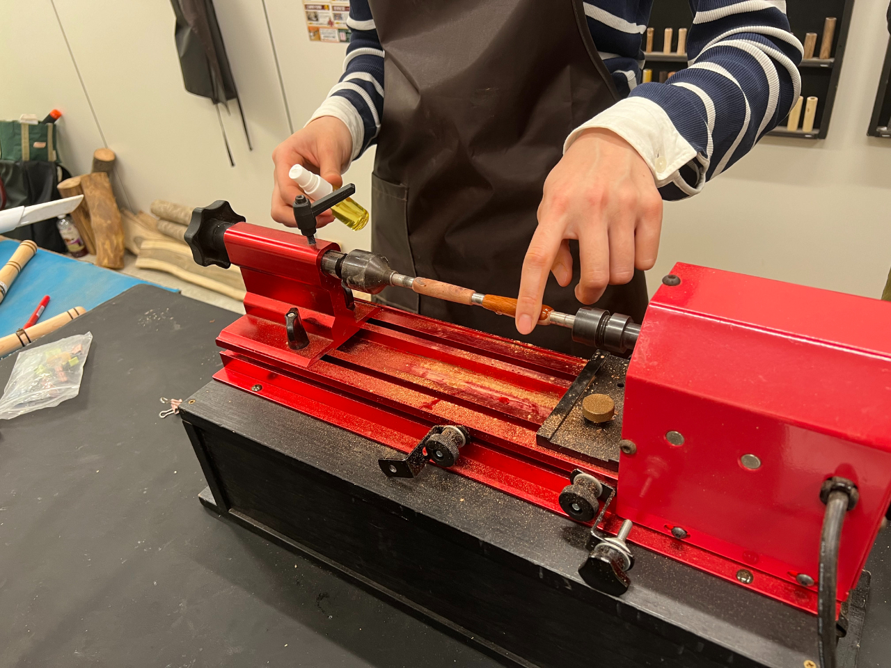 木軸ペンの軸はバイト(刃物)を使い好きな形に削り、研磨で仕上げていきます。キーホルダーは研磨で仕上げます。