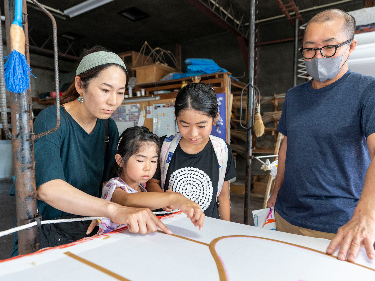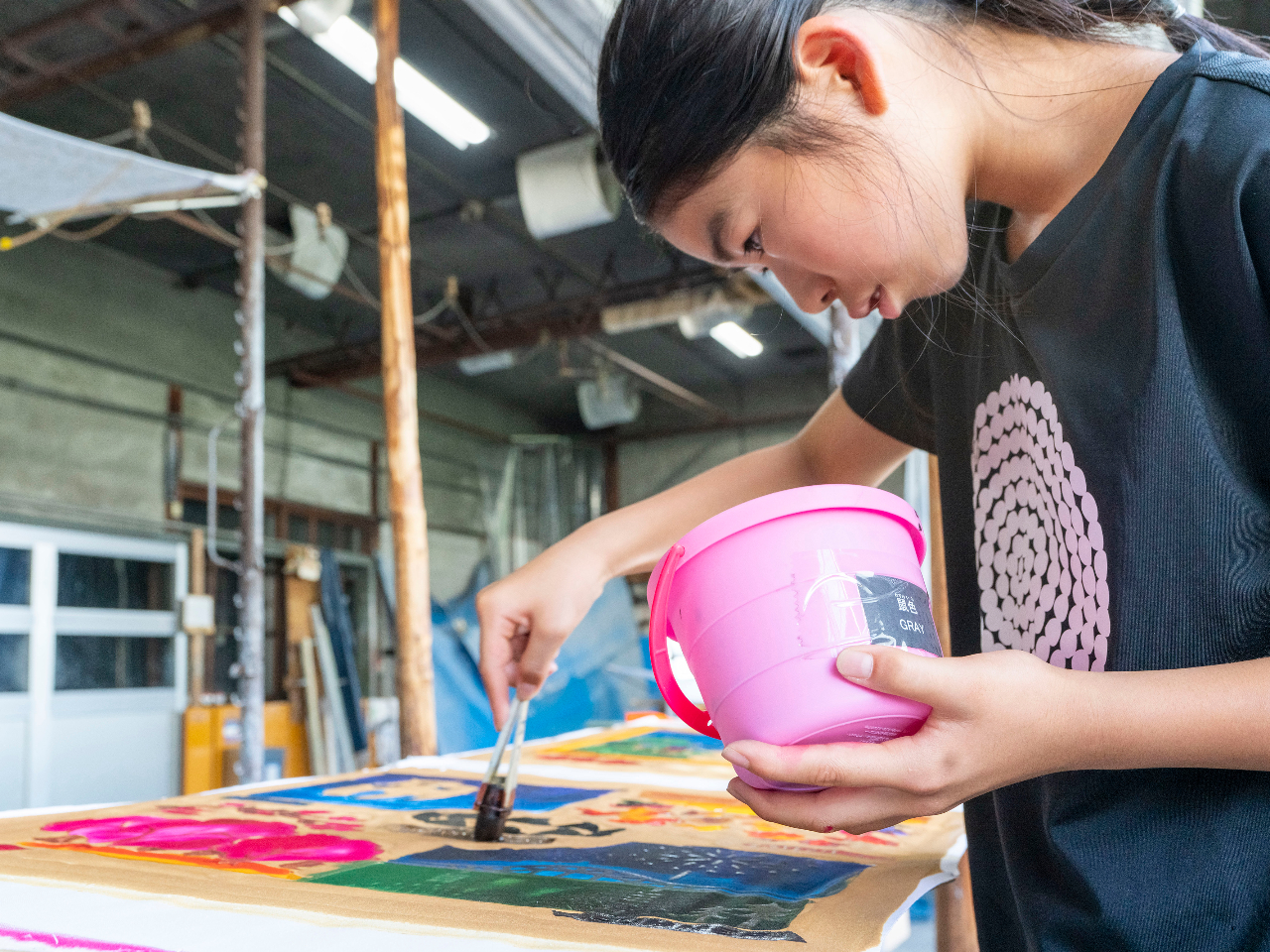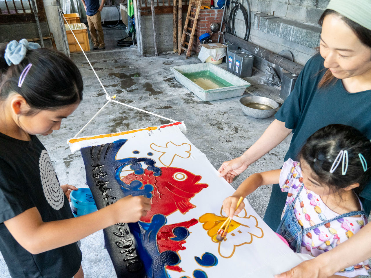 体験前には実際に工場で大漁旗等を制作する職人さんの仕事風景も見学可能です!染色・染物体験