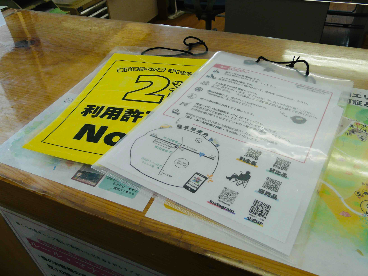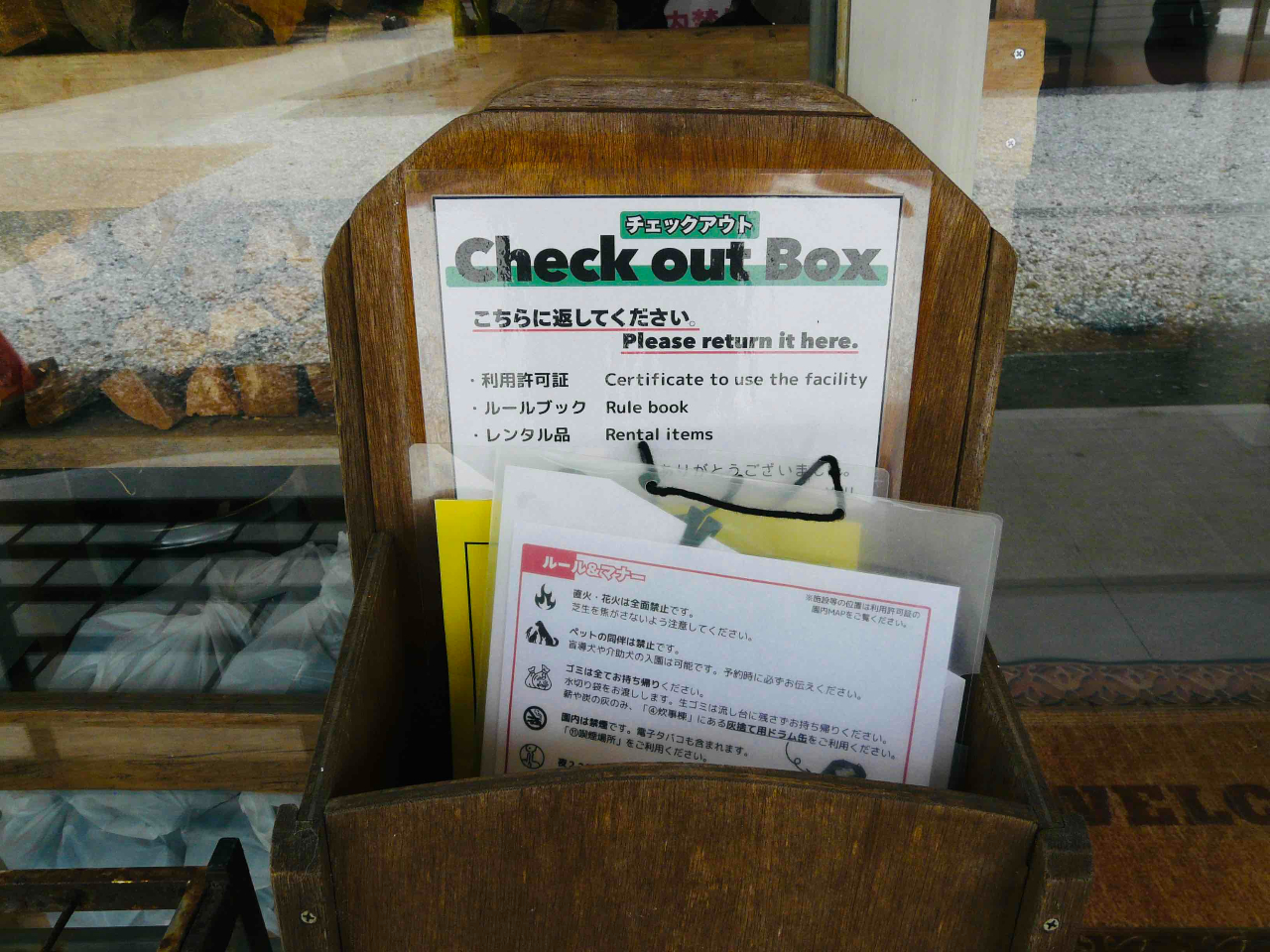 ※受付前に返却BOXがありますので、その中に許可証とルールブック・レンタル品を返却していただければ、お好きな時間にチェックアウト可能です。