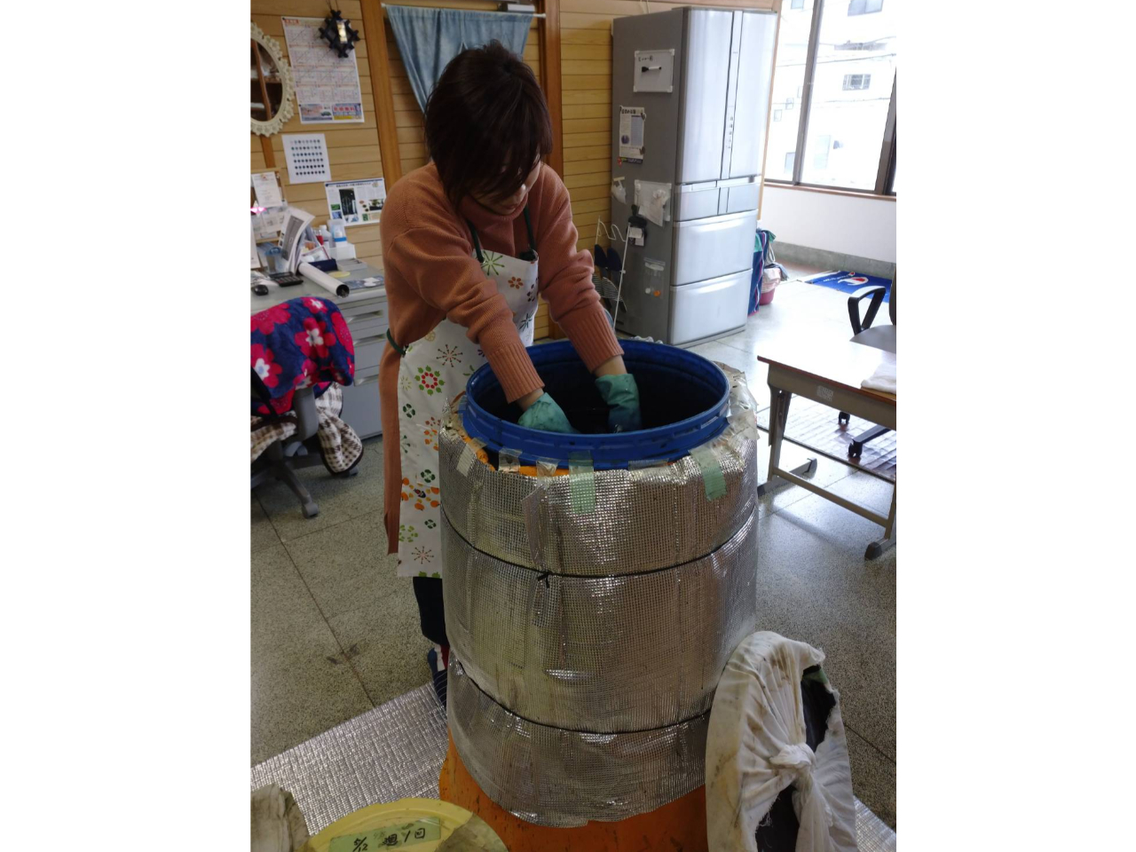 徳島産の「すくも」を使用した天然灰汁発酵建ての染料を日々管理しています。