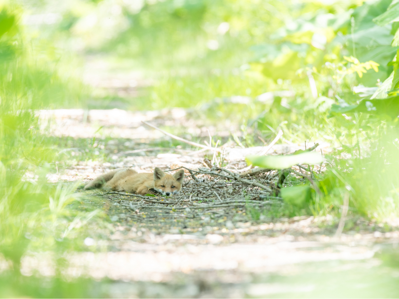 木道を歩いているとキツネが寝てるかも、踏まないように注意