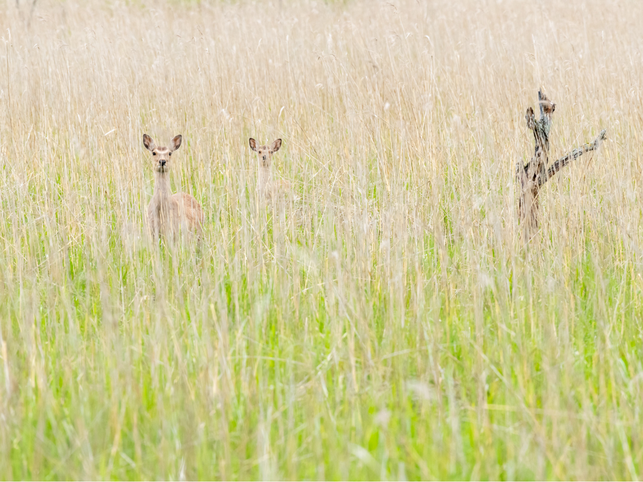 ヨシの草ごしにエゾシカがこちらを伺っているのはよくある湿原の風景