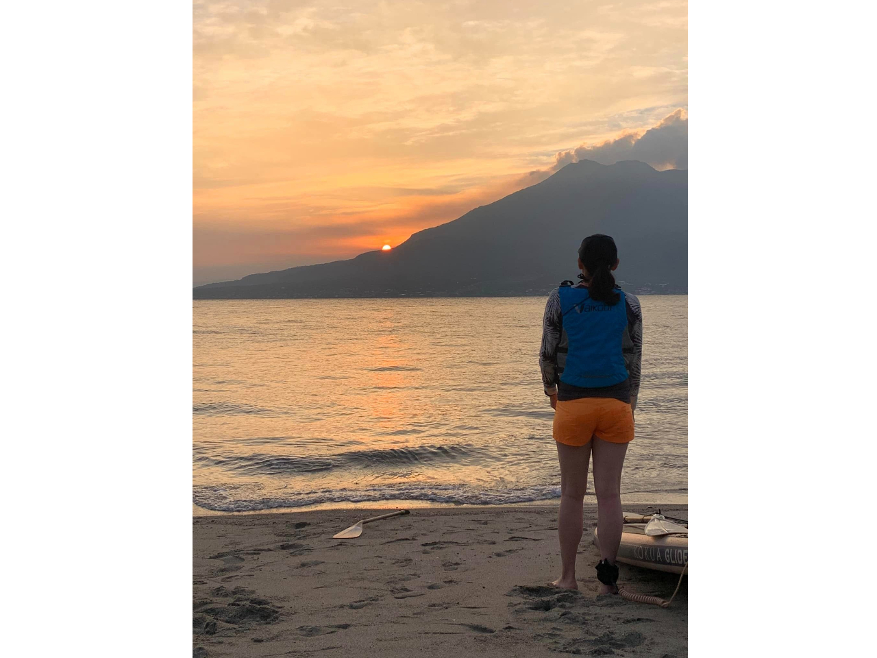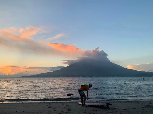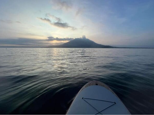 ホテル南洲館から車で10分 絶景活火山 桜島を眺め サップで漂いながら朝焼けマジックアワー体感しませんか? 運が良ければ爆発シーンやイルカにも遭遇できますよ。