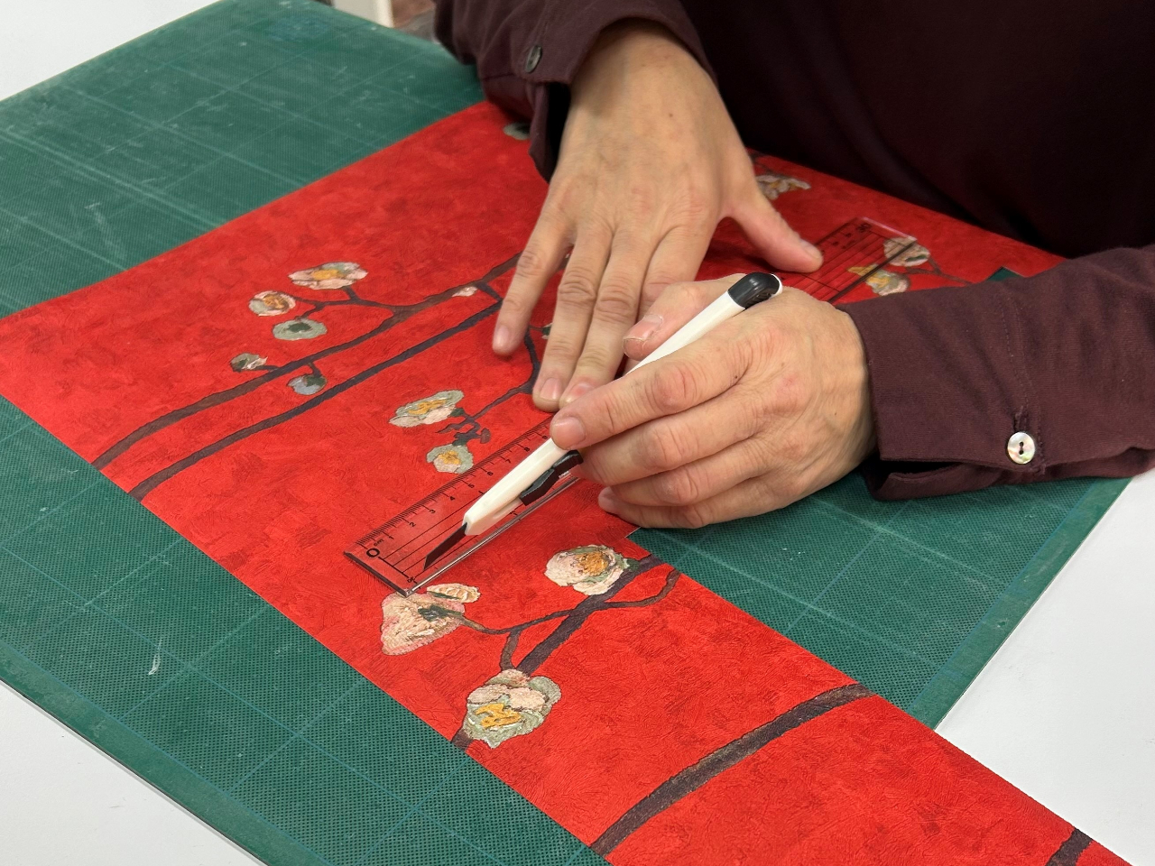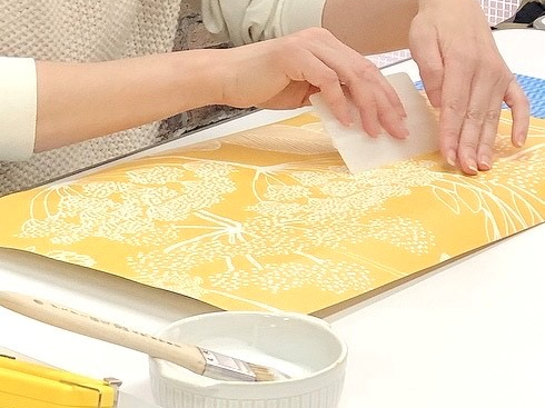 壁紙用の糊を塗り、空気を抜いて、タッカーで止める…工程の説明も丁寧にわかりやすくして頂き、失敗もなく1時間弱で完成。