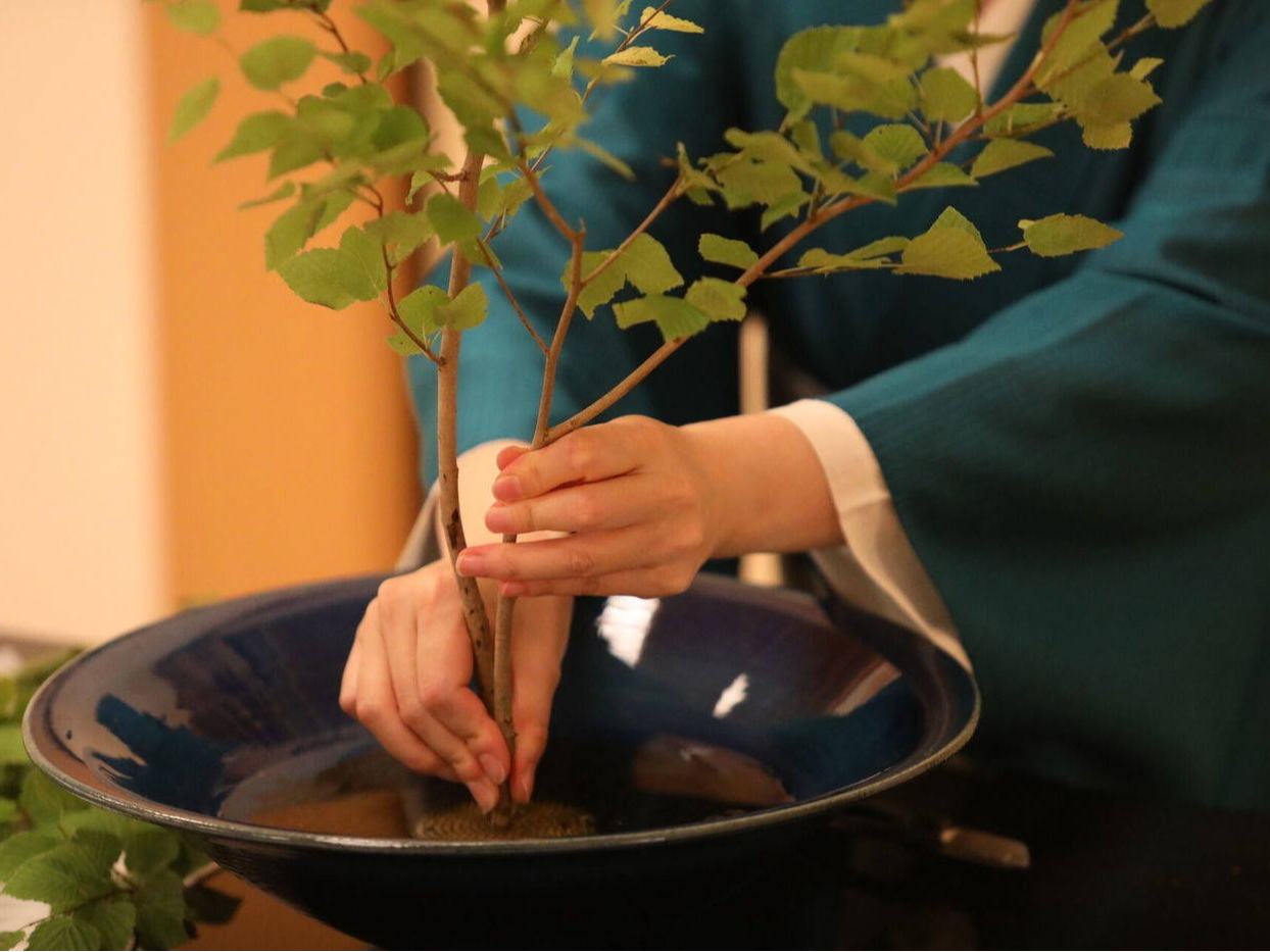 体験中にはウェルカムドリンクの抹茶をお楽しみいただき、講師がいけばなの本質