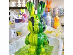 ずっと以前から気になっていて、タイミングよく体験することができました。完成している作品を見て、こんな風にうまくできるのかと思いましたが、色によって全くちがうものになるのがおもしろいですね。完成したのはしっかりマーブルは出たもののブルーが強く出て落ち着いたかんじで、もう少しハデな色合いでもよかったかなと思ったら、自宅に届き梱包されたものから解放されると色味が変わってピンクがきれいに流れています。ちいさいウサギさんはグリーンをメインに入れました。どちらもとってもかわいいです。もう一度やりたいなって思うくらい楽しかったです。