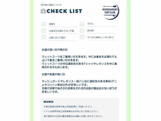 あり(プラン料金込) ※夏はウエットを着用すると暑いため濡れても良い服装をご準備いただきます |