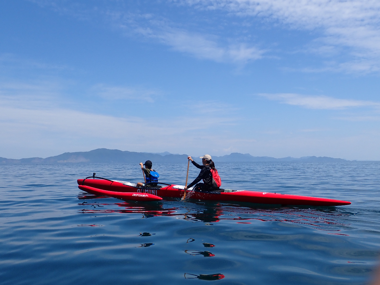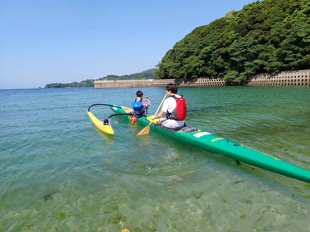 波の穏やかな不知火海でアウトガーカヌーを楽しもう!普段見ることのない海の上から見る景色、子どもから大人まで安全に楽しめるアウトリガーカヌーです。