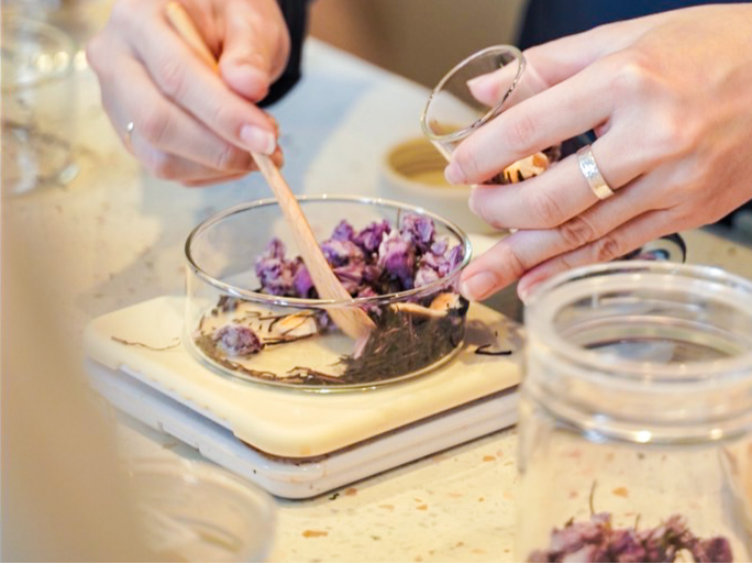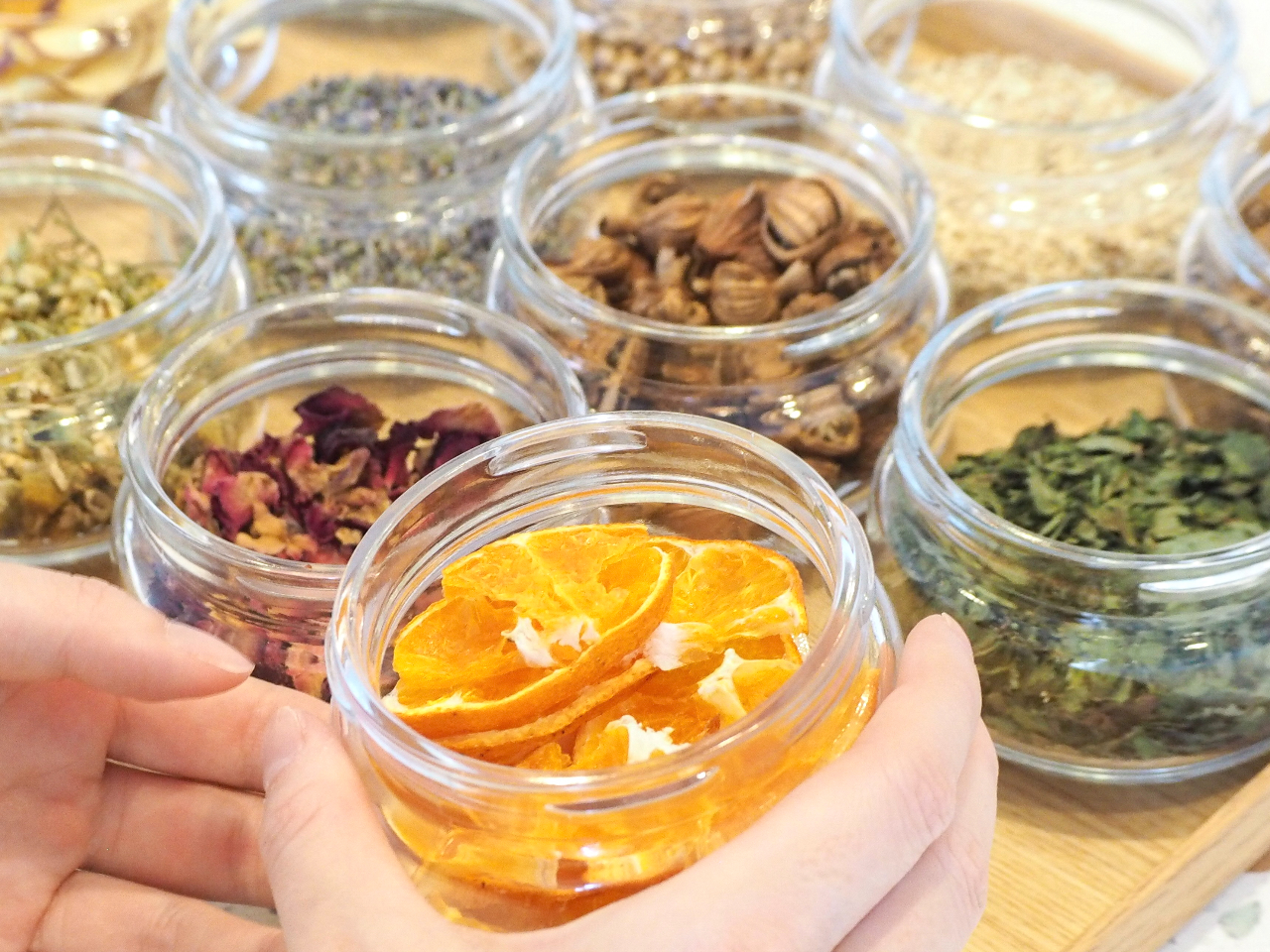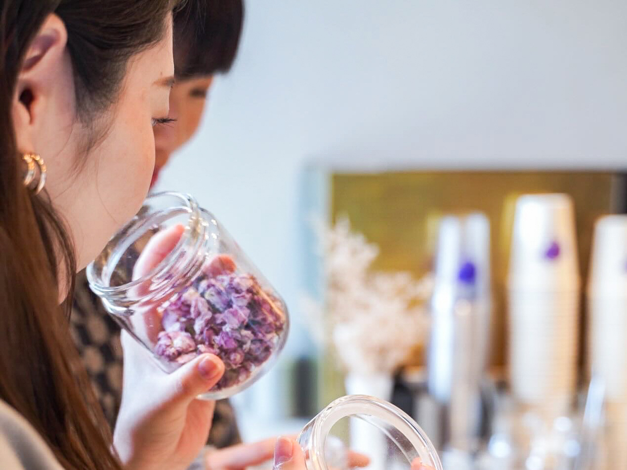 A次に季節ごとに変わる12種類の果実やお花、野草やスパイスの中から気になる素材を香ったり、専門スタッフに効能やおすすめの組み合わせを聞いたりしながら2種類〜3種類を選んでブレンド