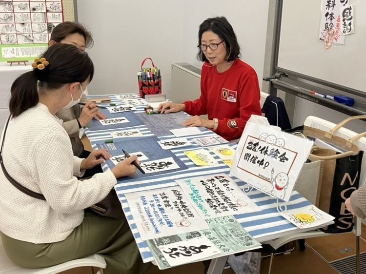 筆ペンを使って味のある文字を描く「己書」の体験。