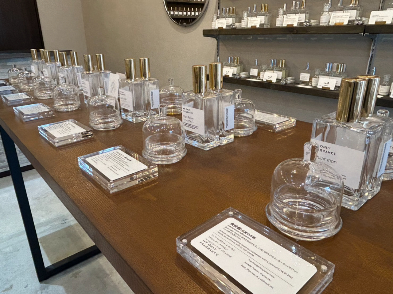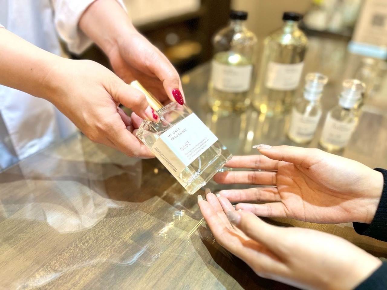 店内に並ぶ数十のフレグランスからお好きな香りを複数選び、目の前でひとつひとつ調合。