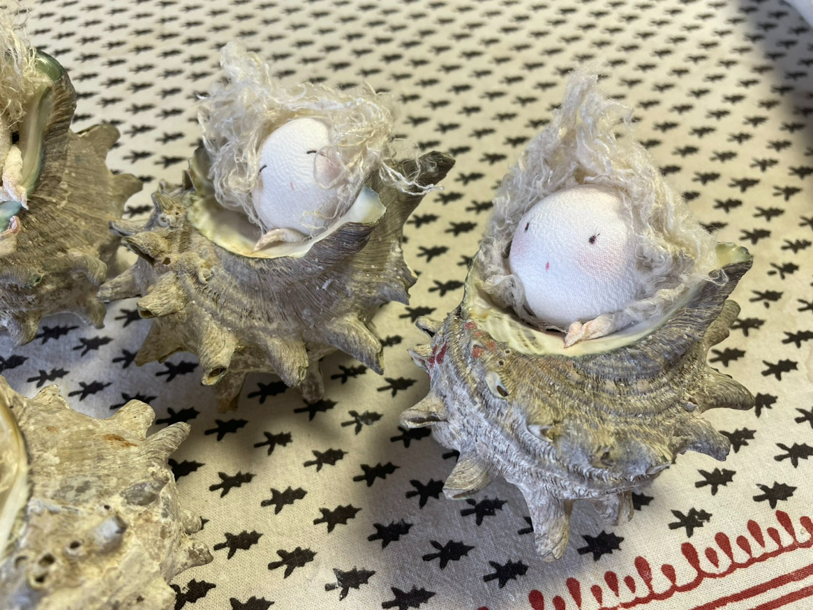 サザエ貝、粘土で顔作り、白縮緬で貼り、絹キビソ髪あしらって、完成。その日にお持ち帰り出来ます。