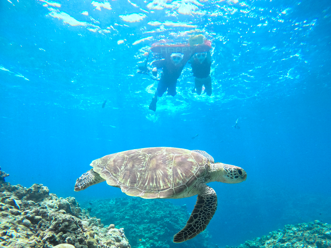 HAPPYのシュノーケルツアーでは、ウミガメとの遭遇率は驚異の99.99%。
