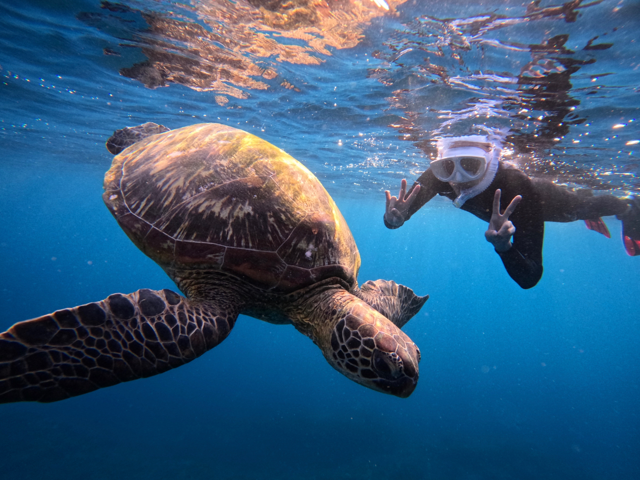 ウミガメが水面まで上がってきたタイミングで一緒に泳ぎます♪