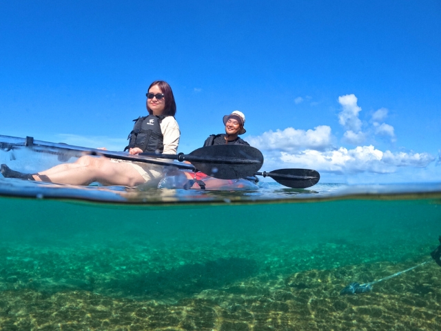 透明なカヤックで、水面と水中の世界を同時に楽しめる貸切ツアーです。