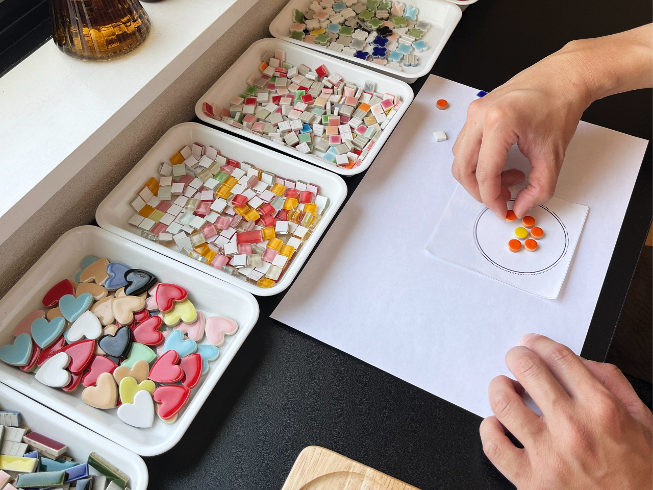 色んな形やカラフルなモザイクタイルを自由に組み合わせて作る
