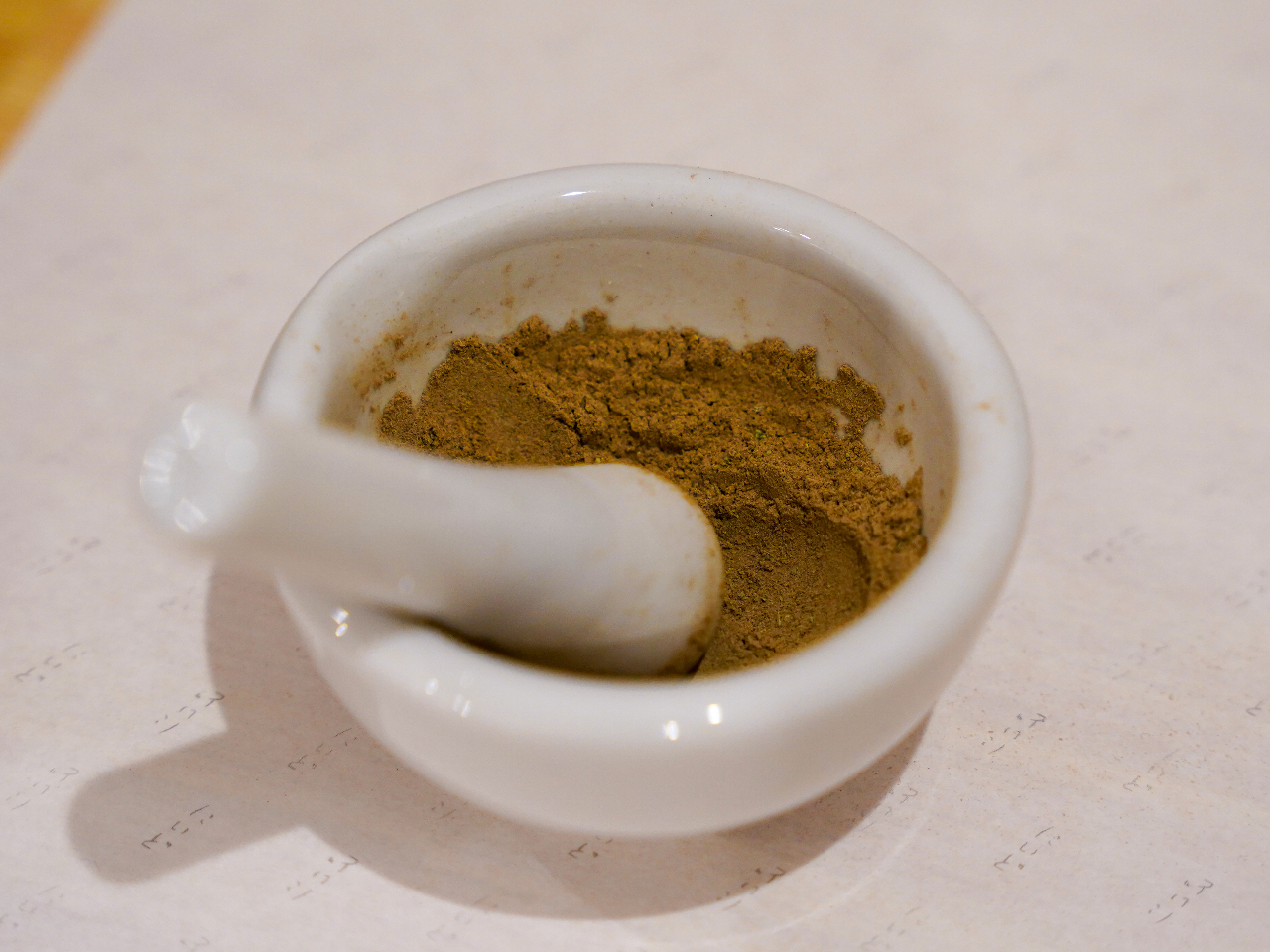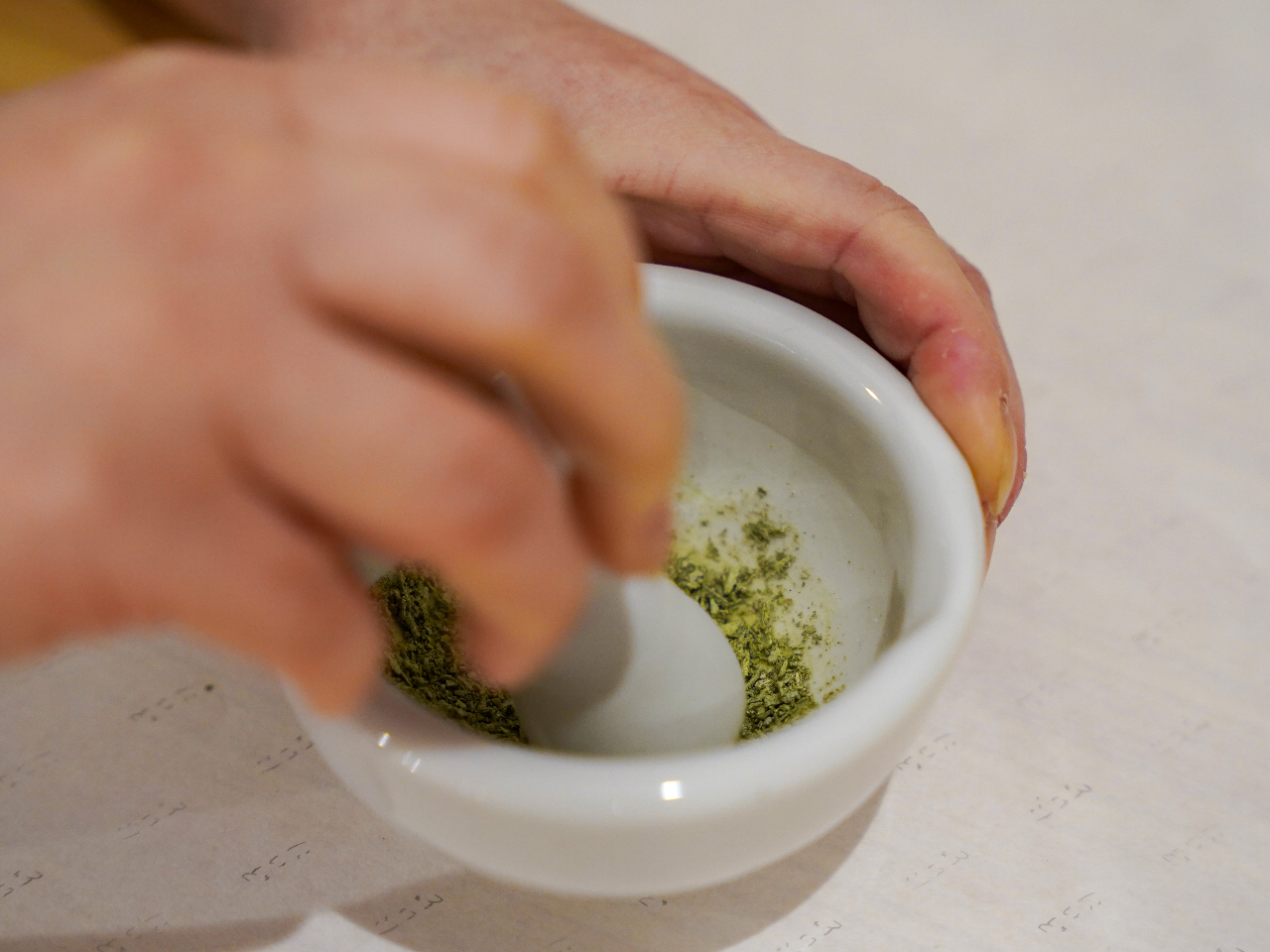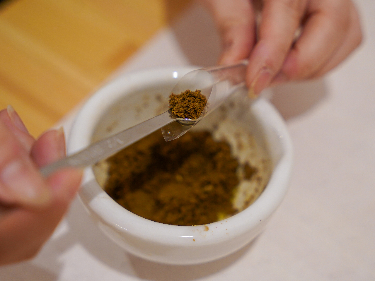 4.香木やスパイスの粉を乳鉢に入れて混ぜ合わせます。