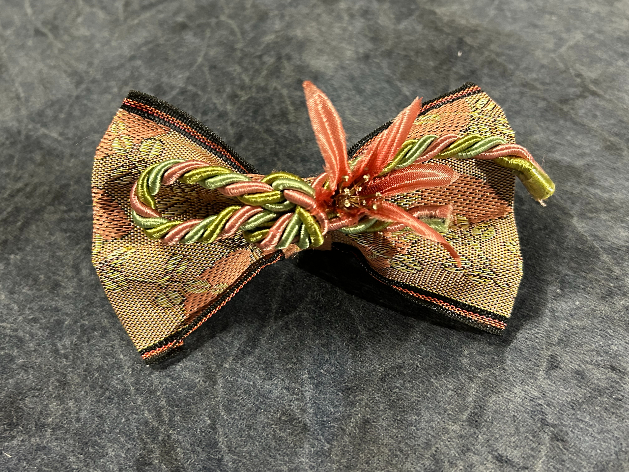 体験:土台の畳のデザインを5、6種類?から選び、その土台の裏に貼る生地を何種類かの色を選びテープをはがして貼り付けて、真ん中あたりの紐を3種類ほどから選んで取り付けます!上記説明の多種造花もつけて完成、各々取付る場所や角度を体験者が決めて先生が取り付けてくれるので、デザインにこだわるが天然で不器用なパートナーでも問題なかったです(後で怒られそう・・・)