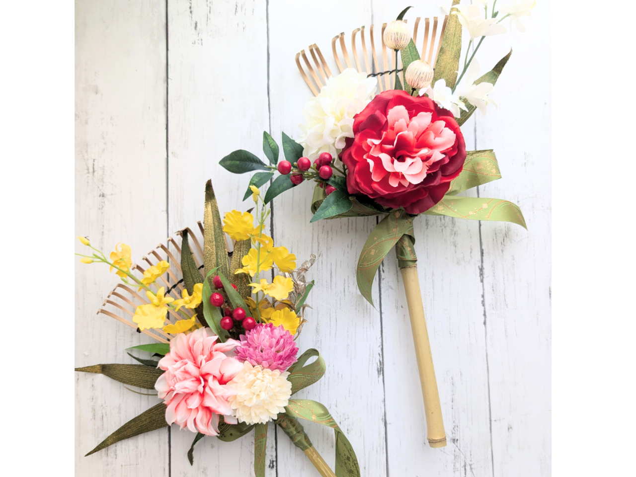 好きなお花を選びたい放題、世界に一つの花熊手を作れるレッスンです。