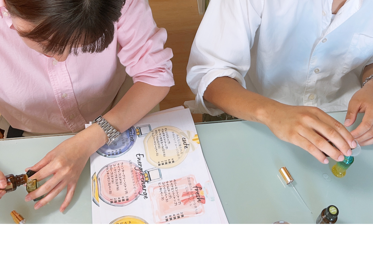 必要な材料は、はすべてこちらでご用意いたしますので手ぶらでお越しください香水作り