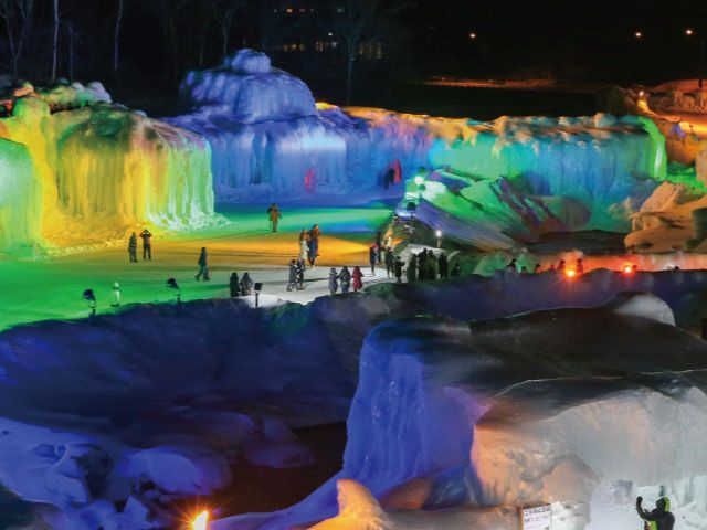 石狩川の河川敷を利用した会場の広さは1万平方メートル。寒い時期にしか現れない氷の王国は大雪山麓の深い渓谷の自然を生かし、柱状節理の断崖絶壁から落ちる滝が巨大な氷瀑となってそそり立つ姿を目の当たりにできる層雲峡温泉の一大イベントです。ライトアップされた幻想的な氷の造形物は美しく神秘的で、厳寒の北海道を直に感じられるお祭りです。色とりどりのライトに照らされた幻想的な氷像は必見!