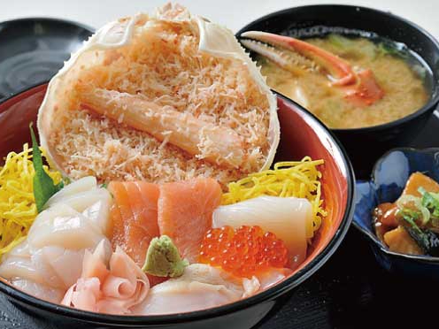 オホーツク海を代表する味覚が詰まったズワイガニ、いくら、ホタテが入った豪華海鮮をどんぶりにした流氷丼をご用意。たっぷりカニの入った流氷丼をカニ汁と一緒にどうぞ!