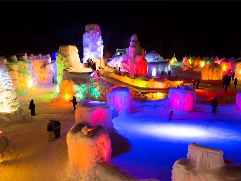 ライトアップされた幻想的に輝く氷像を観に行こう!氷像は高い透明度を誇る支笏湖の湖水で作られており色とりどりにライトアップされた氷の芸術の数々は、ファンタジックでもあり神秘的な風景でもあります。もちろん流行りのSNS映えもしっかり狙えます。